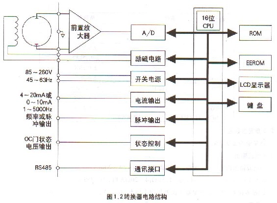 自來(lái)水電磁流量轉(zhuǎn)換器一方面向電磁流量傳感器勵(lì)磁線圈提供穩(wěn)定的勵(lì)磁電流,以達(dá)到B是個(gè)常量;同時(shí)把轉(zhuǎn)換器感應(yīng)的電動(dòng)勢(shì)放大、轉(zhuǎn)換成標(biāo)準(zhǔn)的電流信號(hào)或頻率信號(hào),便于流量的顯示、控制與調(diào)節(jié)。圖1.2所示為轉(zhuǎn)換器電路結(jié)構(gòu)。