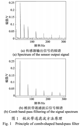 我們對采集到的實際傳感器輸出信號進行頻譜分析后發(fā)現(xiàn)其頻譜范圍較寬,不僅含有明顯的基波和奇次諧波分量,在其他分量處也有值,如圖1(a)中所示的在0頻率分量處的直流漂移和50Hz頻率分量處的工頻干擾等。針對輸出信號的這種特點,采用梳狀帶通濾波器,該濾波器能保留特定的頻率分量,而抑制其他的頻率分量。這樣,如圖1(a)所示的傳感器輸出信號經(jīng)過梳狀帶通濾波器后,有用的基波和奇次諧波分量將通過濾波器,而其他分量將被大幅度的抑制,濾波后的信號頻譜如圖1(b)所示,可以較大程度地抑制噪聲的影響。