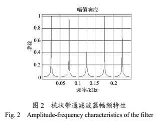 要實現(xiàn)上述信號處理方法,要求所設計的濾波器對勵磁頻率的奇數(shù)倍的頻率分量處的增益為1,而其他頻率分量則被大幅度的削弱。其幅頻特性曲線如圖2所示。