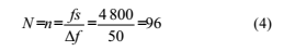 由頻譜特性可知,該濾波器相當于多個通帶帶寬很窄的帶通濾波器的聯(lián)合,形狀上很像一把梳子。由式(2)可知,所要保留的基波和所有奇次諧波分量在0~fs范圍內(nèi)是均勻分布的。因此,所要求的帶通濾波器的個數(shù)n為fs除以需要保留的頻率點之間的間隔,即n=fs/△f。n必須為整數(shù),所以選擇的采樣頻率必須為間隔△f的整數(shù)倍。當傳感器輸出信號為fo=25Hz,采樣頻率為4.8kHz時,△f=2fo=50Hz。