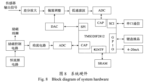 為了實現(xiàn)該算法,研制了基于DSP的電磁流量計系統(tǒng),開發(fā)了電磁流量計系統(tǒng)軟件,對傳感器輸出信號進行實時處理 。