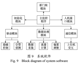 系統(tǒng)軟件設計采用模塊化設計方案,由主監(jiān)控程序程序統(tǒng)一調(diào)用。軟件總體框圖如圖9所示。系統(tǒng)軟件包含的主要功能模塊有:初始化模塊、驅動模塊、數(shù)據(jù)處理模塊、通信模塊、看門狗模塊和人機接口模塊等。