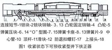 可預(yù)收緊型井下扶正器分別連接在電磁流量計(jì)的上端與下端,構(gòu)成上下扶正器,下井前用手或?qū)S檬站o工具,橫向上壓縮固定在彈簧卡座總成上4組彈簧片,在外力作用下簧片徑向收縮,在收縮過(guò)程中帶動(dòng)彈簧卡座徑向位移,撥動(dòng)滑塊,頂桿向上徑向位移,同時(shí)轉(zhuǎn)動(dòng)凸輪,當(dāng)凸輪邊緣上的球面凹坑與頂桿成水平線時(shí)松開(kāi)頂桿,頂桿下端圓球面與凸輪上的球面凹坑偶合,松開(kāi)4組彈簧片,此時(shí)彈簧片處于收緊狀態(tài),將儀器裝入防噴管內(nèi),打開(kāi)測(cè)試閘門儀器即可下井,如圖1所示。