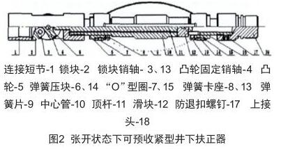 下井的儀器帶動(dòng)測(cè)井鋼絲下行 [2] ,通過(guò)井下偏心配水器時(shí),凸輪上的鎖塊克服鎖塊扭簧的扭力作用向上翻轉(zhuǎn),儀器可以順利通過(guò)偏心配水器,當(dāng)下到井筒內(nèi)任何一級(jí)偏心工作筒下方時(shí),地面絞車上提儀器,儀器上行經(jīng)過(guò)偏心配水器,鎖塊帶動(dòng)凸輪順時(shí)針旋轉(zhuǎn),頂桿球面與凸輪球面凹坑偶合脫開(kāi),頂桿上的滑塊在彈簧片彈力作用下向下位移帶動(dòng)頂桿進(jìn)入到凸輪凹腔內(nèi),同時(shí)扶正器上4個(gè)彈簧片在彈力作用下張開(kāi)貼附在油管內(nèi)壁上(見(jiàn)圖2)保證了儀器在油管內(nèi)居中,然后按照測(cè)試方案即可分層流量測(cè)試。