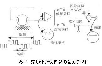雙頻矩形波勵磁測量原理如圖1所示,一個由高低頻分量迭加而成的電磁場通過勵磁線圈被施加到被測液體中,勵磁波形是在一個低頻矩形波上迭加一個高于市電頻率的矩形波而得到的波形。在產(chǎn)生的電動勢中,低頻分量通過一個大時間常數(shù)的積分電路獲得一個零點穩(wěn)定性好的平穩(wěn)流量信號。而由漿液或低電導(dǎo)率流體產(chǎn)生的低頻噪聲可被不受噪聲影響的高頻采樣電路所抑制,有著同樣時間常數(shù)的流量信號經(jīng)過一個差分電路以確定流速信號的變化,把這兩種不同頻率采樣所得的信號結(jié)合起來可獲得一個穩(wěn)定流速信號,該信號不受噪聲干擾,且有較高的零點穩(wěn)定性。