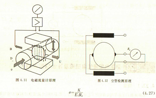 非滿管檢測(cè)也是基于電導(dǎo)率檢側(cè)的方法。在圖4.33所示的電磁流量傳感器中,增加了一個(gè)(或一對(duì))非滿管檢測(cè)電*。當(dāng)導(dǎo)管內(nèi)液體滿管時(shí),頂部電*與其他電*之間的電阻值很小;而當(dāng)存在非滿管情況時(shí),頂部電*與導(dǎo)電液體之間有氣體阻隔,所以電*電阻顯著增大,從而做出非滿管判斷。