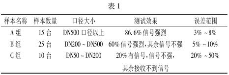 通過(guò)大量的在線檢測(cè)試驗(yàn),可以看出所測(cè)管道管徑對(duì)超聲流量計(jì)測(cè)試效果有明顯影響。根據(jù)數(shù)據(jù)顯示,管徑越大,測(cè)試效果越好,示值誤差越小。隨著管徑的減小,超聲流量計(jì)所能檢測(cè)到的流速信號(hào)也隨著變?nèi)?,?dāng)口徑小于 DN50 時(shí),基本沒(méi)有信號(hào)或是產(chǎn)生巨大的干擾信號(hào)。