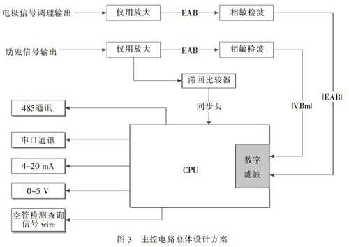 電*檢測(cè)出的微弱感應(yīng)電動(dòng)勢(shì)E, 先經(jīng)前置放大器的放大和噪聲抑制而成為大幅度低阻抗的電壓信號(hào)。此信號(hào)經(jīng)相敏檢波后,給CPU 進(jìn)行數(shù)字濾波、處理和控制,通過(guò)利用雙線性變換法將模擬的二階巴特沃斯低通濾波器轉(zhuǎn)換為數(shù)字式濾波器,既簡(jiǎn)化電路設(shè)計(jì),且可靠性高、穩(wěn)定性好。通過(guò)編寫(xiě)軟件CPU 能對(duì)放大器的溫度漂移及零點(diǎn)漂移給予補(bǔ)償, 并在測(cè)量的全量程范圍內(nèi)分10 段對(duì)信號(hào)進(jìn)行非線性修正,使得測(cè)量值更好地?cái)M合真實(shí)數(shù)據(jù)??展軝z測(cè)電路上,CPU 作為從控制器。當(dāng)主控制電路上發(fā)出空管檢測(cè)查詢信號(hào)wire, 從控制器進(jìn)行識(shí)別后接收并判斷出查詢什么信號(hào),然后產(chǎn)生應(yīng)答信號(hào)上傳至主控芯片輸出顯示;當(dāng)檢測(cè)為空管信號(hào)時(shí), 從CPU 發(fā)出的zero 信號(hào)通過(guò)控制MOS 管開(kāi)關(guān)來(lái)關(guān)斷流速輸出。在應(yīng)用中,對(duì)于微弱信號(hào)的放大及提取還需注意PCB 板設(shè)計(jì)時(shí)EMI 電磁屏蔽考慮,屏蔽來(lái)自空間磁場(chǎng)的干擾、周邊設(shè)備的輻射造成的干擾和板內(nèi)之間的干擾,如數(shù)模分離、強(qiáng)弱電分離等等。