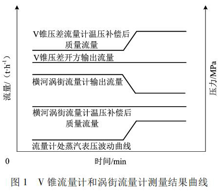 根據(jù)物料平衡反復研究,渦街流量計測量的質(zhì)量流量動態(tài)曲線比較客觀反映了蒸汽流量的變化; 而 V 錐流量計測量的質(zhì)量流量偏大 5%。說明該差壓流量計元件沒能產(chǎn)生和實際流量變化對應的差壓。