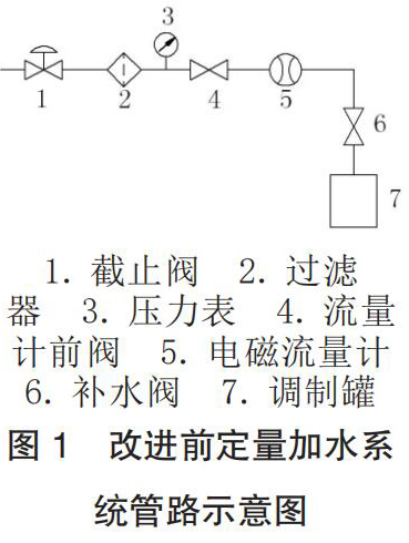 工廠的香料廚房系統(tǒng)為國內煙機公司 2004 年設計制造,其定量加水系統(tǒng)主要由水源、JKM-LDE電磁流量計、加水管路元件和控制程序這四部分組成,改進前管路示意圖如圖 1 所示。