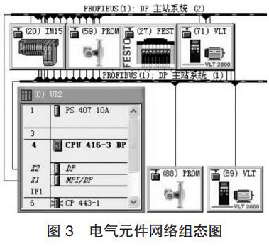 (1)電氣元件組態(tài)。把增加的質量流量計和變頻器添加到香料廚房 S7-400 PLC 控制系統(tǒng)的 PROFIBUS 網中,其網絡組態(tài)如圖 3 所示,圖中 PROFIBUS-DP 地址 88 和 89 為硬件系統(tǒng)增加的質量流量計和變頻器。