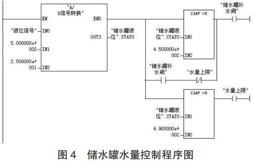 (2)程序設計。儲水罐水量控制的工作過程為:當壓力變送器檢測到儲水罐的水量低于 450kg 時,補水閥 3 開啟為儲水罐補水;當水量達到 490kg 時,補水閥 3 關閉;生產配制過程中,循環(huán)以上控制過程。儲水罐水量控制的程序如圖 4 所示。