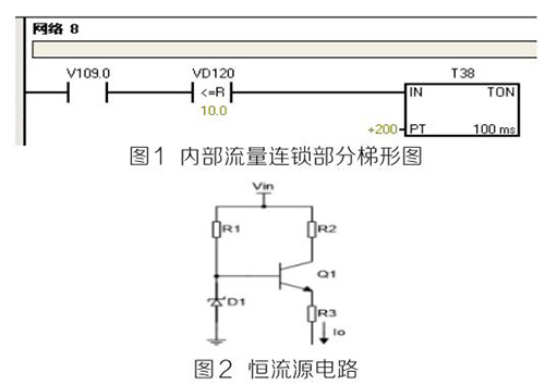 (2)PLC及模塊。PLC及模塊是自動(dòng)化控制系統(tǒng)主要設(shè)備,且PLC及模塊屬于高集成高精密電子設(shè)備,保持室內(nèi)整潔舒適,可以提高自動(dòng)化系統(tǒng)運(yùn)行穩(wěn)定性。PLC及模塊硬件運(yùn)行可靠,內(nèi)部控制程序是其控制核心軟件,如PLC硬件出現(xiàn)故障或損壞一般直接更換,但原內(nèi)部控制軟件無(wú)法上傳,整個(gè)控制系統(tǒng)成失控狀態(tài)。所以其內(nèi)部控制程序在調(diào)試驗(yàn)收合格后應(yīng)及時(shí)備份并做好標(biāo)記,為以后修復(fù)PLC故障提供保障。PLC系統(tǒng)的維護(hù)技術(shù)人員需掌握一定基礎(chǔ)PLC控制邏輯原理,對(duì)準(zhǔn)確判斷PLC故障點(diǎn)有很大的幫助。例如選礦廠水泵房S7-200系列PLC自動(dòng)抽水系統(tǒng)出現(xiàn)如下故障 :觸摸屏能控制變頻器啟動(dòng)水泵抽水,但在短時(shí)間內(nèi)會(huì)自動(dòng)停泵,導(dǎo)致無(wú)法正常抽水。通過(guò)故障現(xiàn)象可初步判斷PLC及模塊硬件設(shè)備正常,主要由于某個(gè)變量有問(wèn)題導(dǎo)致連鎖停機(jī)。打開備份PLC控制梯形圖程序進(jìn)行相關(guān)分析,原來(lái)是排污流量計(jì)瞬時(shí)流量數(shù)值做了連鎖,其在一定時(shí)間內(nèi)瞬時(shí)流量不大于10m 3 /h時(shí),自動(dòng)停泵,電磁流量模擬量輸出電流值僅為4ma且無(wú)變化,確定排污流量計(jì)有故障??膳R時(shí)應(yīng)急維修,模擬量模塊輸入模擬電流值10ma~20ma之間一固定數(shù)值即可恢復(fù)正常運(yùn)行。制作簡(jiǎn)單恒流源電路代替排污流量計(jì)輸出的模擬電流量,實(shí)現(xiàn)解決水泵無(wú)法正常運(yùn)行的故障。