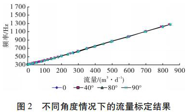 為了考察井眼斜度變化對dn500污水流量計測量流量的影響,開展了非集流dn500污水流量計在不同斜度情況下的流量測量模擬實驗。模擬實驗在大慶油田多相流實驗室進行,儀器外徑 38 mm,模擬井筒內(nèi)徑為 124 mm,實驗介質(zhì)是水,傾斜角度分別為 0°、40°、80°和 90°( 水平) ,流量范圍為 5 ~ 850 m3 /d。實驗結(jié)果表明,在儀器居中條件下,井眼斜度變化對dn500污水流量計的儀表常數(shù)沒有影響,滿量程誤差不大于 4% ,因此可以應(yīng)用dn500污水流量計進行水平井注水剖面測量。不同角度情況下的實驗結(jié)果如圖 2 所示。