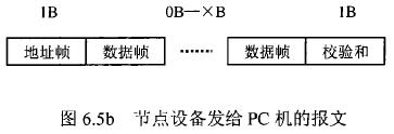 在硫酸流量表等節(jié)點設備和C機通信的過程中,由地址幀、命令幀、數(shù)據(jù)幀、校驗和可組成各種功能不同的報文。由于采用主從工作方式來實現(xiàn)通信,硫酸流量表等節(jié)點設備僅能接收并執(zhí)行PC機發(fā)送來的控制命令,而不能發(fā)送命令給PC機。因此,由PC機發(fā)往流量計等節(jié)點設備的報文一般包括一個地址幀,一個命令幀,若干個數(shù)據(jù)幀和一個校驗和,其報文格式圖.6a5所示;而由流量計等節(jié)點設備發(fā)往PC機的報文一般包括一個地址幀,若干個數(shù)據(jù)幀和一個校驗和,其報文格式如圖6.5b所示。