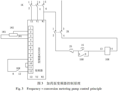 STD - Ⅲ型浮選工藝參數(shù)自動測控系統(tǒng)通過雙膜盒差壓計測量原礦漿濃度; 采用冷卻水計量表測量原礦漿流量,由 PLC 計算出入浮干煤泥量和藥劑的瞬時添加量,用變頻式計量泵完成浮選藥劑的添加。通過上位機還可以打印小時、班、天及月的運行數(shù)據(jù),更加有利于生產(chǎn)管理及技術(shù)分析,藥劑自動原理如圖 2 所示,k1、k2、k3 是計算修正參數(shù)。以 PID 算法為核心,通過優(yōu)化控制程序計算出藥劑給定量,在捕收劑和起泡劑管道上分別安裝藥劑測量裝置,用于檢測藥劑的添加量。當藥劑測量值小于藥劑給定量時,PID 輸出增大,反之則減小。加藥泵變頻器控制原理如圖 3 所示。
