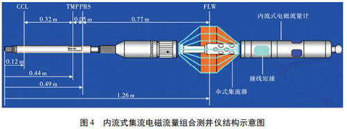 1. 2 內(nèi)流式集流燒堿流量計(jì)如圖 4 所示,內(nèi)流式集流電磁組合測(cè)井儀主要采用內(nèi)流式集流燒堿流量計(jì),并組合了井溫壓力磁定位儀。利用電磁感應(yīng)原理測(cè)量平均流速,體積流量計(jì)算公為: