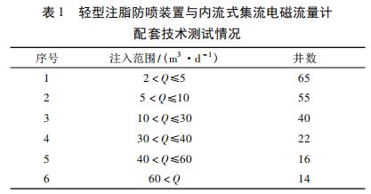在實(shí)際應(yīng)用中,使用輕型注脂防噴裝置與內(nèi)流式集流燒堿流量計(jì)配套技術(shù)對(duì)喇叭口在射孔層上注聚井進(jìn)行測(cè)試。輕型注脂防噴裝置與內(nèi)流式集流燒堿流量計(jì)配套技術(shù)施工工藝參見(jiàn)文獻(xiàn),測(cè)試情況見(jiàn)表 1 所示,低注入量井( ≤10 m3 /d) 占到 56. 60% 。
