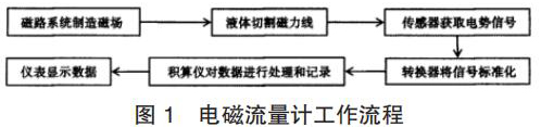 酸堿液計(jì)量表的產(chǎn)生主要是基于法拉*電磁感應(yīng)定律。在酸堿液計(jì)量表的應(yīng)用中,磁路系統(tǒng)會(huì)在流量計(jì)運(yùn)行過(guò)程中逐步出現(xiàn)直流磁場(chǎng)與交流磁場(chǎng),該磁場(chǎng)的產(chǎn)生為后期的測(cè)量提供了良好的前提條件,營(yíng)造了測(cè)量所需的磁場(chǎng)環(huán)境,因此,在酸堿液計(jì)量表應(yīng)用時(shí),一旦被測(cè)液體在導(dǎo)管中經(jīng)過(guò)該磁場(chǎng)環(huán)境時(shí),必然會(huì)產(chǎn)生一定的切割磁力線運(yùn)動(dòng),在這種情況下,電*傳感器就會(huì)發(fā)揮其作用,將導(dǎo)管內(nèi)的流量轉(zhuǎn)換為感應(yīng)電勢(shì)信號(hào),隨后此轉(zhuǎn)換形成的信號(hào)逐步被傳遞給轉(zhuǎn)換器。而轉(zhuǎn)換器更是可以將所獲得的流量信號(hào)等加以處理,通過(guò)分析、對(duì)比等,轉(zhuǎn)換器會(huì)將該信號(hào)變?yōu)闃?biāo)準(zhǔn)信號(hào),隨后將該信號(hào)輸出給積算儀,進(jìn)一步進(jìn)行信號(hào)的處理,這些處理以后的信號(hào)*終會(huì)在酸堿液計(jì)量表的儀表中顯示,呈現(xiàn)*終的流量測(cè)量結(jié)果,其基本的流程如圖 1 所示。