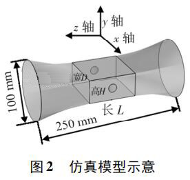 使用 Pro /E 軟件建立三維幾何模型,導(dǎo)入 COMSOL 軟件進(jìn)行有限元求解。仿真模型如圖 2 所示,電*連線為x 軸,連線中點(diǎn)為坐標(biāo)原點(diǎn),流體運(yùn)動(dòng)方向?yàn)?z 軸,傳感器管道口徑為 DN100,總長(zhǎng)250 mm。異徑管部分初始結(jié)構(gòu)尺寸 L = 80 mm,D = 80 mm,H = 40 mm,圓形電*半徑為17 mm,伸出絕緣襯里的*大距離為 1. 5 mm。