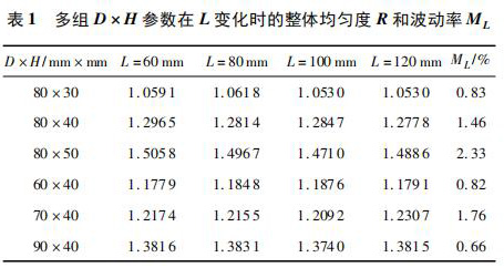 計(jì)算多組相同 D × H、不同 L 時(shí) xy 平面的權(quán)函數(shù)整體均勻度 R 及波動(dòng)率 ML,如表 1 所示。