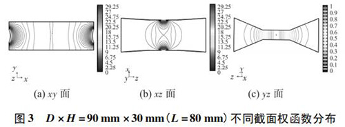 4) 圖 3( c) 、圖 4( c) 的 yz 面權(quán)函數(shù)分布表明,D = 90 mm時(shí)的權(quán)函數(shù)等勢(shì)線間距略大于 D = 60 mm 時(shí)的權(quán)函數(shù)等勢(shì)線間距,權(quán)函數(shù)變化梯度較小,且中心區(qū)域的權(quán)函數(shù)等勢(shì)線逐漸變?yōu)橹本€,因此 D = 90 mm 的權(quán)函數(shù)分布更均勻一些,但是兩者區(qū)別很小,即寬度改變對(duì) yz 面權(quán)函數(shù)分布影響很小。圖 4( c) 、圖 5( c) 的 yz 面權(quán)函數(shù)分布表明,H = 30 mm時(shí)的權(quán)函數(shù)等勢(shì)線間距較大,且中心區(qū)域的權(quán)函數(shù)等勢(shì)線逐漸變?yōu)橹本€,因此 H = 30 mm 的權(quán)函數(shù)分布更加均勻;