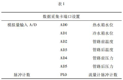 數(shù)據(jù)采集系統(tǒng)由工控機、潛水電磁流量計以及數(shù)據(jù)采集卡組成。 4000 次冷熱沖擊試驗要求在在*大流量 qs 條件下運行,對流量數(shù)據(jù)的采集用到潛水電磁流量計及數(shù)據(jù)采集卡。潛水電磁流量計采集管路流量,數(shù)據(jù)采集卡將潛水電磁流量計采集到的數(shù)據(jù)反饋給工控機系統(tǒng)。過程中,試驗管路水溫以及水箱水位的采集控制也是通過數(shù)據(jù)采集卡反饋給系統(tǒng)控制。試驗過程用到的數(shù)據(jù)采集卡采用研華生產(chǎn)的PCI - 1711。PCI - 1711 是一款多功能 PCI 總線數(shù)據(jù)采集卡,具有 16 路單端模擬量輸入功能、2 路 12位模擬量輸出功能、16 路數(shù)字輸入和 16 路數(shù)字輸出功能、計數(shù)器功能等。為保證冷熱沖擊試驗結(jié)果的準確性,嚴要求嚴格控制管路流量以及管路壓力。因此,管路設置前后管路溫度、冷熱水箱水位以及管路壓力的采集,管路流量根據(jù)潛水電磁流量計脈沖計數(shù)進行采集,其數(shù)據(jù)采集卡端口設置如表 1 所示。