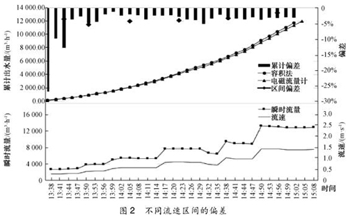 圖 2 的結(jié)果顯示,容積法校驗(yàn)電磁流量計(jì)累計(jì)偏差開始階段不穩(wěn)定,后期趨于穩(wěn)定,在 -3. 0%附近。這是測量中不可避免存在某幾個(gè)時(shí)刻(特別出廠水流量改變時(shí))某些測量點(diǎn)液位波動(dòng)較大,導(dǎo)致記錄數(shù)值與真實(shí)情況存有較大差異,一開始累計(jì)出水總量較少,偏差會(huì)相對(duì)放大,在后期累計(jì)水量大,這一原因?qū)е碌钠顪p少,偏差值也趨于穩(wěn)定。
