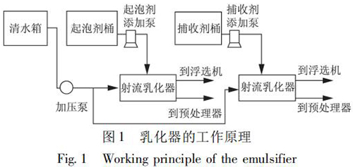 選煤廠浮選藥劑乳化裝置是將藥劑和水制成乳化液,實(shí)現(xiàn)藥劑的合理使用,將對(duì)浮選效果和節(jié)約藥劑起到一定的作用。在使用中可根據(jù)藥劑和水的配制比例觀察藥劑的乳化效果,通過(guò)乳化器操作箱內(nèi)的的電位器調(diào)整水泵轉(zhuǎn)速,即調(diào)整乳化壓力。自動(dòng)加藥控制是根據(jù)入浮流量與入浮濃度的檢測(cè)結(jié)果,控制起泡劑與捕收劑的加入。乳化器的工作原理如圖 1 所示。