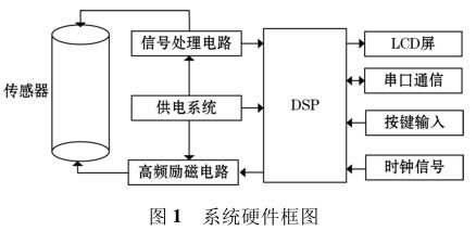高頻勵磁電鍍污水計量表由傳感器、高頻勵磁電路、信號處理電路等組成,其中高頻勵磁電路決定著傳感器磁場的強弱,勵磁電路的穩(wěn)定性以及精確性決定著系統(tǒng)檢測的準(zhǔn)確性以及穩(wěn)定性。DSP 系統(tǒng)控制勵磁電路激勵傳感器線圈,當(dāng)線圈中有導(dǎo)電液體流過時,其切割磁感線并在傳感器兩端的線圈上產(chǎn)生感應(yīng)電動勢,利用信號檢測電路監(jiān)測感應(yīng)電動勢的大小,*后根據(jù)相應(yīng)關(guān)系計算出液體的流量,系統(tǒng)硬件框圖如圖 1 所示。