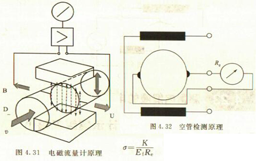 鍋爐水流量計是專為測量導(dǎo)電液體的體積流量而設(shè)計的。測量原理是基于法拉*電磁感應(yīng)定律。按照該定律,導(dǎo)電流體通過磁場作切割磁力線運(yùn)動時,在垂直于磁場及流速的方向上產(chǎn)生感應(yīng)電動勢,此電動勢由4.14節(jié)中的式4.24)給出。其原理如圖4.31所示。
