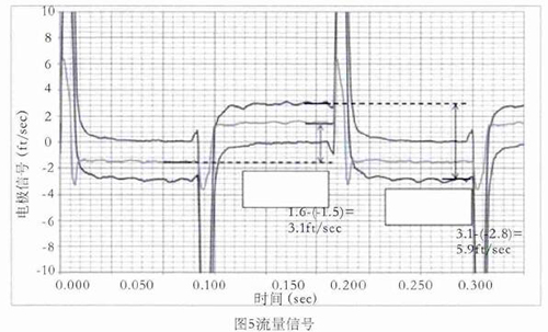 舉例,如圖5所示,線圈采用5Hz驅(qū)動時的0feet/s,3.1feet/s,5.9feet/s流速下的電*信號,利用上述方法對信號進(jìn)行處理并計算流速。取每半波*后的20%納入流速計算,正半波與負(fù)半波相減即是流速。如3.1feet/s–(-2.8feet/s)=5.9feet/s,雖然有+0.15 feet/s的直流偏置,但也不影響流速的計算。因線圈是5Hz驅(qū)動,半波的20%是20ms,正好是1個完整的工頻周期,這樣就不受工頻干擾的影響。正半波與負(fù)半波相減,這樣就避免了直流偏置和共模干擾的影響。再加上在數(shù)字濾波過程中使用限幅濾波和算數(shù)平均,保證了流量信號的有效提取。