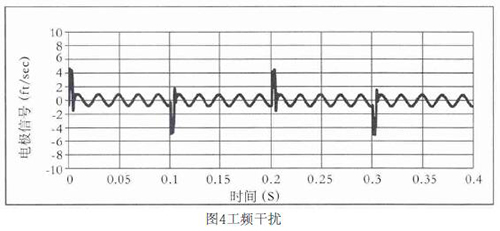工頻干擾是給排水流量計常見的干擾源。當(dāng)流量計處于電源形成電磁場中時,由于分布電容的存在,以電磁波的輻射形式干擾電*信號,或者是由供電電源引入的工頻串?dāng)_,工作現(xiàn)場的工頻共模干擾,其產(chǎn)生的物理機(jī)理均是電磁感應(yīng)原理。幅度與流量信號相比,往往要大幾個數(shù)量級,頻率與供電電源頻率相同。如圖4所示,線圈驅(qū)動頻率為5Hz的電*信號,被耦合了50Hz的工頻干擾,幅度大概相當(dāng)于1feet/s。