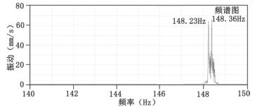 *后,通過對兩臺(tái)凝電磁流量計(jì)并列運(yùn)行工況下的出口管道振動(dòng)進(jìn)行頻譜分析(見圖2)發(fā)現(xiàn),葉片通過頻率附近出現(xiàn)了兩個(gè)相距很近的頻率,分別為148.23Hz和148.36Hz。這兩個(gè)頻率的振動(dòng)分屬于兩臺(tái)凝電磁流量計(jì)所引發(fā)的,即兩臺(tái)凝智能電磁流量計(jì)工作轉(zhuǎn)速有微小差別,導(dǎo)致兩個(gè)頻率分量之間也出現(xiàn)了微小差別,進(jìn)而導(dǎo)致拍振現(xiàn)象。