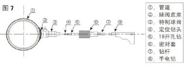 將密封墊圈放入已焊接好的底座中,再將特制球閥擰入,注意壓緊密封墊圈,防止漏水。將開孔器密封護套與球閥外螺紋連接。擰緊后,打開球閥,推動鉆桿直至與管道外壁接觸,將手電鉆與鉆桿接好鎖緊,接通電源,開始鉆孔。在鉆孔過程中電鉆保持低速,轉(zhuǎn)速不要過快、以免卡鉆,甚至鉆頭折斷。鉆透后,拔出鉆桿直到開孔器鉆頭的*前端退至球閥芯后,關(guān)上球閥,卸下開孔器。