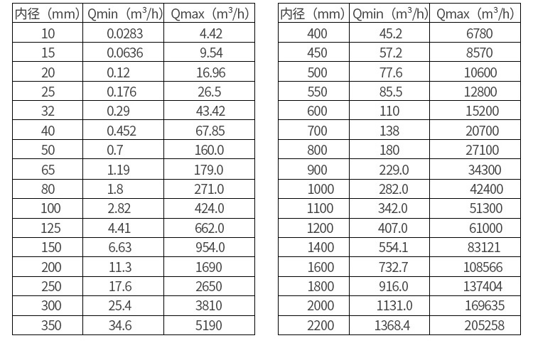 二、電鍍廢水流量計口徑、流速流量對照表: