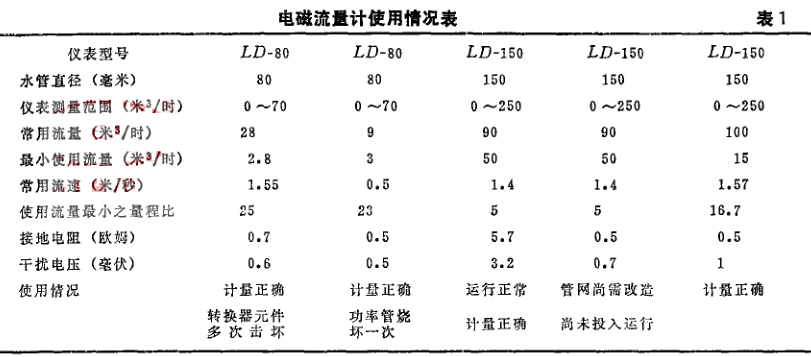 我廠自1981年3一8月,分別對(duì)四個(gè)車間的用水點(diǎn)安裝了五臺(tái)儀表,每臺(tái)配用一支DX S-102積算器,測(cè)定的是生產(chǎn)用水,溫度為常溫,電導(dǎo)率為1.2x10-3姆歐,安裝方式為水平有旁路伐(見表1)。