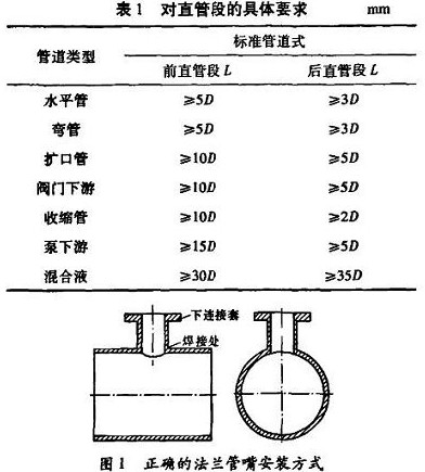 流體在方向、管徑以及閥門開度變化時(shí),會(huì)產(chǎn)生渦流和流場畸變,這樣會(huì)對傳感器電*的測量產(chǎn)生影響,從而影響儀表的精度。所以要盡可能地離開彎管、手閥、調(diào)節(jié)閥等部件一定距離,直管段的具體要求見表1。表中,D表示管道通徑,L表示傳感器到閥門或彎頭等部件的距離。