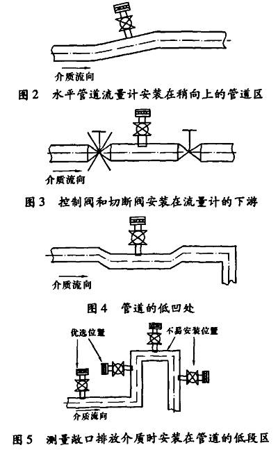 為了保障測量精度,傳感器應(yīng)避免在容易產(chǎn)生真空、氣體、渦流等地方安裝,傳感器與智能變送器之間的通訊電纜要避開電動(dòng)機(jī)等強(qiáng)電設(shè)備。建議安裝在圖2~圖5所示位置。