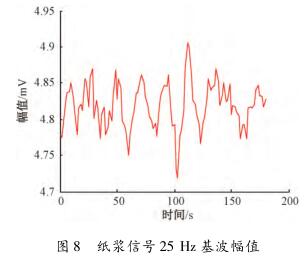 在頻域中對紙漿信號觀察時(shí)發(fā)現(xiàn),紙漿信號的漿液噪聲頻帶在零頻率點(diǎn)附近,距離流量信號基波頻率點(diǎn)較遠(yuǎn),對基波幅值和各奇次諧波幅值基本沒有影響,紙漿信號在頻域中的圖形如圖7所示。選擇一組采集的紙漿信號,把其等分成數(shù)段,利用MATLAB計(jì)算每段數(shù)據(jù)在基波處的幅值并提取保存在一個(gè)數(shù)組中,使用繪圖工具畫出來,如圖8所示。可見,基波幅值在4.7~4.95mV變化,波動(dòng)較小。因此,提取到的與流量相關(guān)的感應(yīng)電動(dòng)勢信號幅值會(huì)比較穩(wěn)定。