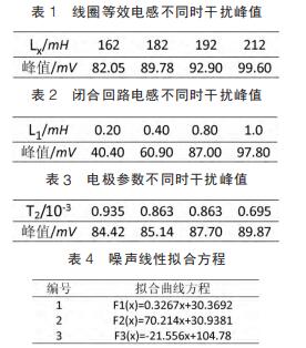 仿真試驗(yàn)中,設(shè)定線圈等效電感取值范圍為 162~212mH,間隔 10mH;閉合回路等效電感范圍 0.2~1mH,間隔為 0.2mH;雙電層電容、接觸電阻隨流體電導(dǎo)率變化而變化,電導(dǎo)率增大接觸電阻和雙電層電容減小而電荷傳遞電阻增大??稍O(shè)定電*接觸電阻、雙電層電容和電荷傳遞電阻范圍分別為 5~15kΩ、10~20μF 和50~60Ω,由公式(7)知,可用 T2 表示上述三者關(guān)系。 仿真參數(shù)取值不同情況下,通過(guò) MATLAB 工具箱對(duì)仿真測(cè)量得到的干擾峰值進(jìn)行曲線擬合畫出相應(yīng)的曲線圖。 其中仿真數(shù)據(jù)和相對(duì)應(yīng)的曲線方程如表 1~表 4 所示,曲線圖如圖 4~圖 6。