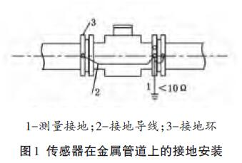 傳感器安裝在塑料管道或內(nèi)壁有絕緣涂層、襯里的管道上,兩端應(yīng)安裝接地環(huán)(或帶有接地電*的金屬短管),然后用導(dǎo)線連接,使管內(nèi)流動(dòng)的介質(zhì)與大地短路,具有零電位(見(jiàn)圖2)。