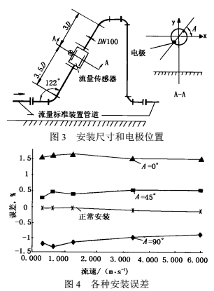由于受條件限制無法在現(xiàn)場(chǎng)用經(jīng)典的測(cè)量方法(如流速計(jì)流速面積法)作比對(duì)試驗(yàn),以估計(jì)彎管影響附加誤差值。并且使用方必須在訂購之前就要知道附加誤差估計(jì)值,以決定設(shè)計(jì)方案。筆者按相似原理以較小口徑1寸電磁流量計(jì)在實(shí)驗(yàn)室模擬現(xiàn)場(chǎng)條件作試驗(yàn)。試驗(yàn)證明45°安裝可減小彎管影響.并求得該個(gè)案安裝條件下傳統(tǒng)安裝方式的影響值。
