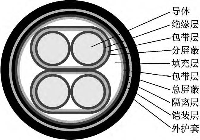 該新型電纜的結(jié)構(gòu)如圖1所示。導體為單股退火鍍錫軟銅線,以提高導體的導電性和防腐蝕性。在導體外繞包一層?。疲矗ň鬯姆蚁┌雽щ妿В欣诮档蛯w和絕緣之間的摩擦起電噪音。絕緣采用材料較為純凈、介電常數(shù)較小、具有一定彈性的聚丙烯絕緣級材料,并采用擠壓式擠出,減小絕緣層與導體的間隙。采用對絞組作為信號傳輸線,由于在兩根傳輸線上感應的電壓接近相等,減小了電壓差值,提高了信號傳輸穩(wěn)定性;對絞組由兩種不同顏色絕緣線芯組成,相鄰線對對絞節(jié)距應不大于100mm。對絞分屏蔽組(即對對絞組進行分屏蔽,每對對絞組外繞包兩層聚酯帶和一層厚0.04mm鋁塑復合帶繞包,內(nèi)置一根7×0.26mm鍍錫銅絞線作引流線)有利于對不同對絞組之間信號串音的抑制和隔離。對絞分屏蔽組同心式絞合成纜,在對絞分屏蔽組間填充非吸濕性材料,以保證纜芯圓整。在成纜纜芯外繞包兩層聚酯帶,再采用鋁塑復合帶繞包,內(nèi)置鍍錫銅線作引流線,以提高電纜電磁屏蔽能力。總屏蔽層外擠包隔離層(隔離護套),隔離層采用絕緣級低密度聚乙烯材料。隔離層外采用鎧裝層,鎧裝材料為高導磁合金鋼帶,其為強磁材料,可將外來的磁通大部分限制在鎧裝層的外表面上(僅有少部分能進入被屏蔽的空間);鎧裝時對高導磁合金鋼帶采用縱包焊接,確保其形成一連續(xù)圓柱管;鎧裝層可提高電纜抗電磁干擾水平以及對電纜進行加強,減少電纜振動引起的電動勢。外護套采用藍色軟PVC(聚氯乙烯)護層級電纜材料擠包,實現(xiàn)電纜防護。