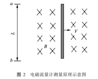 本文選用不同質(zhì)量濃度的煤泥在裝有電磁流量計(jì)的液壓與流變試驗(yàn)臺(tái)上(實(shí)驗(yàn)原理如圖1)進(jìn)行管道輸送實(shí)驗(yàn)。電磁流量計(jì)根據(jù)電磁感應(yīng)原理測量流過管道中導(dǎo)電流體的流量,故使用電磁流量計(jì)的前提是被測流體必須導(dǎo)電,且電導(dǎo)率不能低于閾值(即下限值)。通用型電磁流量計(jì)的閾值在(5×10-6)S/cm~10-4S/cm之間,若電導(dǎo)率低于閾值會(huì)產(chǎn)生誤差甚至不能測量。根據(jù)電磁感應(yīng)原理(如圖2),當(dāng)導(dǎo)電流體在磁場強(qiáng)度為B的磁場中切割磁力線時(shí),在線形長度為L的a和b兩點(diǎn)之間會(huì)產(chǎn)生感應(yīng)電動(dòng)勢,為