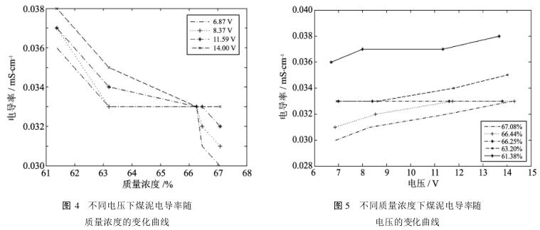 圖4的電導(dǎo)率變化曲線表明,隨著煤泥質(zhì)量濃度的增大,其電導(dǎo)率逐漸降低,并在質(zhì)量濃度為66%時(shí)相交于一點(diǎn);圖5的電導(dǎo)率變化曲線表明,隨著電壓的增大,電導(dǎo)率有逐漸增大趨勢。分析圖4與圖5可得到以下結(jié)論: