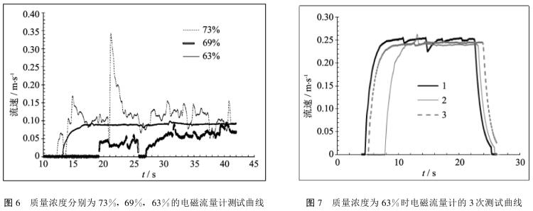 *先分析電磁流量計(jì)流速數(shù)據(jù)的重復(fù)性。圖6是當(dāng)管內(nèi)流速為0.1m/s(即濃密膏體輸送流速下限)時(shí),電磁流量計(jì)測量由大到小的3種質(zhì)量濃度分別為73%,69%,63%的煤泥的實(shí)時(shí)數(shù)據(jù)曲線。由圖可見濃度較高時(shí)電磁流量計(jì)難以測出穩(wěn)定的流速數(shù)值,而當(dāng)濃度較低且煤泥流動(dòng)性非常好時(shí)測量數(shù)值較為穩(wěn)定。圖7是質(zhì)量濃度為63%時(shí)電磁流量計(jì)的3次測試曲線,可見其重復(fù)性良好,故測量結(jié)果可信。相比較煤泥電導(dǎo)率的測試結(jié)果,可以看出當(dāng)質(zhì)量濃度低于63%時(shí),電導(dǎo)率較大,且不同質(zhì)量濃度下電導(dǎo)率變化穩(wěn)定。故推測當(dāng)質(zhì)量濃度低于63%,電導(dǎo)率高于0.035mS/cm時(shí),電磁流量計(jì)應(yīng)用于煤泥管道輸送時(shí)數(shù)據(jù)準(zhǔn)確性較高。
