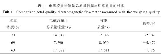 其次提取電磁流量計(jì)的流速數(shù)據(jù)換算并積分后與稱重質(zhì)量進(jìn)行對比,分析其數(shù)據(jù)誤差,結(jié)果如表1??梢酝ㄟ^電磁流量計(jì)積分后的總流量與稱重?cái)?shù)據(jù)的吻合程度來分析,若二者吻合較好則說明電磁流量計(jì)在線測量數(shù)據(jù)顯示雖然可能受到氣泡的影響,但是總流量可以準(zhǔn)確測量;若二者相差較大,則說明電磁流量計(jì)不適合對較高質(zhì)量濃度煤泥進(jìn)行測量。從表1可以看出電磁流量計(jì)在質(zhì)量濃度為69%,73%時(shí)誤差較大,故測量不準(zhǔn)確;在質(zhì)量濃度為63%時(shí)測量誤差較小,說明其測量較準(zhǔn)確。該對比實(shí)驗(yàn)與之前的重復(fù)性分析相符,說明用質(zhì)量濃度及電導(dǎo)率來評價(jià)電磁流量計(jì)測量數(shù)據(jù)的準(zhǔn)確性有一定的可行性。