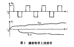 應該指出的是RC濾波對方波信號也起延緩作用,但經(jīng)過七個周期的方波之后,電容上的電壓與方波的實際峰值誤差只有0.02%。電容上的波形與V01的波形如圖3所示。