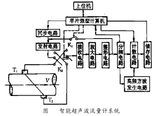 智能超聲波流量計的系統(tǒng)結(jié)構(gòu)如圖2所示。其工作過程是:在上位機的控制下,單片機先對計數(shù)器清零,使開關(guān)K1閉合,K2合向下邊,然后控制同步電路發(fā)出同步啟動脈沖,觸發(fā)超聲波換能器T1發(fā)射*1個超聲脈沖波,同時使計數(shù)電路開始對周期為f的高頻方波進行計數(shù)。該超聲脈沖順流傳播,至T2處被接收并轉(zhuǎn)換成電信號,經(jīng)過放大、整型,一部分返回代替同步信號觸發(fā)T1再次發(fā)射超聲波,如此反復(fù)形成順流發(fā)射聲循環(huán),另一部分進入分頻電路進行分頻。當(dāng)聲循環(huán)M次,分頻器滿并產(chǎn)生一信號,關(guān)斷高頻方波,使計數(shù)停止計數(shù)。同時單片機斷開K1停止聲循環(huán),讀取鎖存器中的順流發(fā)射聲循環(huán)計數(shù)值N1。然后單片機再對計數(shù)器清零,再使開關(guān)K1閉合,K2 合向上邊,觸發(fā)換能器T2 發(fā)射。此次,T2 發(fā)射T1接收,形成逆流發(fā)射聲循環(huán),同樣可得到逆流發(fā)射聲循環(huán)計數(shù)值N2。當(dāng)聲循環(huán)次數(shù)M足夠大,由于統(tǒng)計作用,上述2次聲循環(huán)的固有電聲延遲 (包括超聲波經(jīng)過換能器透聲斜楔、管圖2智能超聲波流量計系統(tǒng)壁等所需的時間以及電信號滯后的時間)之和是相等的,于是當(dāng)f已知且固定不變時,根據(jù)上述公式可將2個計數(shù)值之差 (N2 -N1)換算成流體流速V和流量Q。